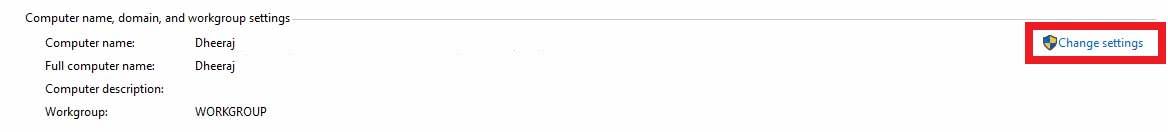 - Here you can find your Computer Details. Under Computer Name, Click on Change Settings.